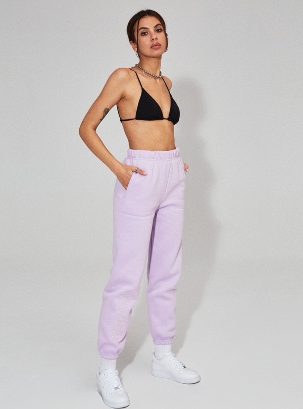Fioletowe spodnie z prostą nogawką u gumką w pasie.